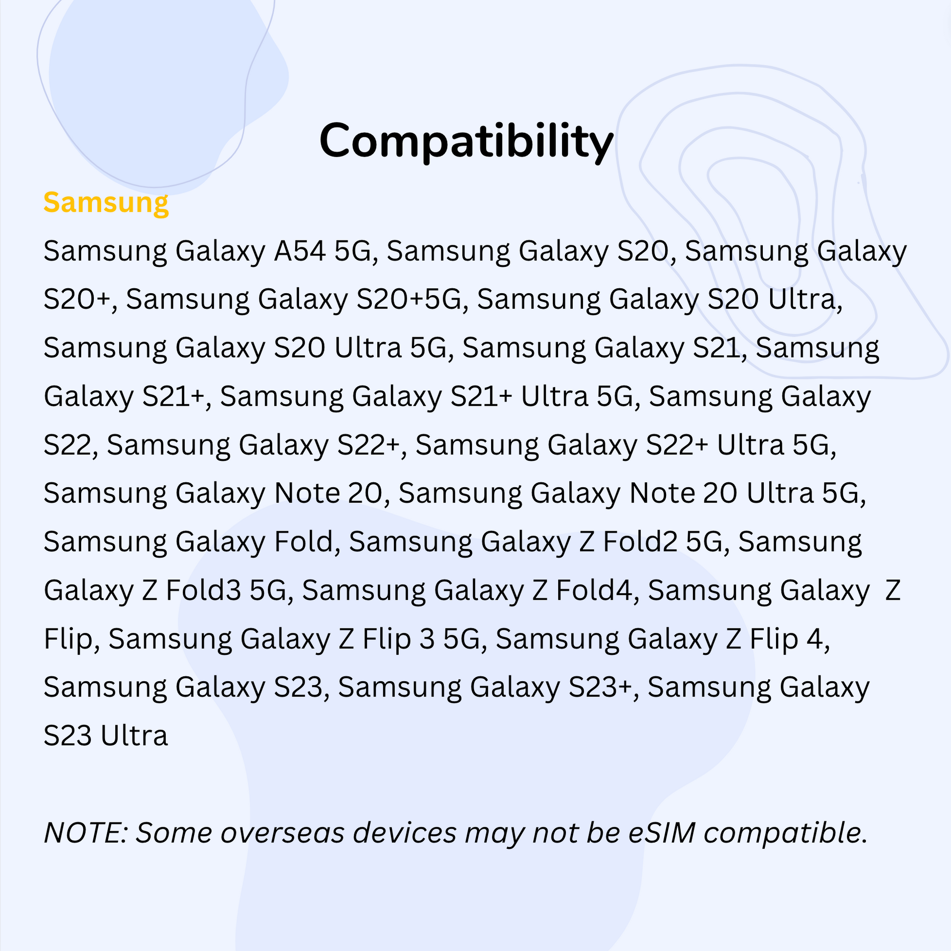 - Huawei: P40, P40 Pro (P40 Pro+ and P50 Pro are not compatible with eSIM), Mate 40 Pro